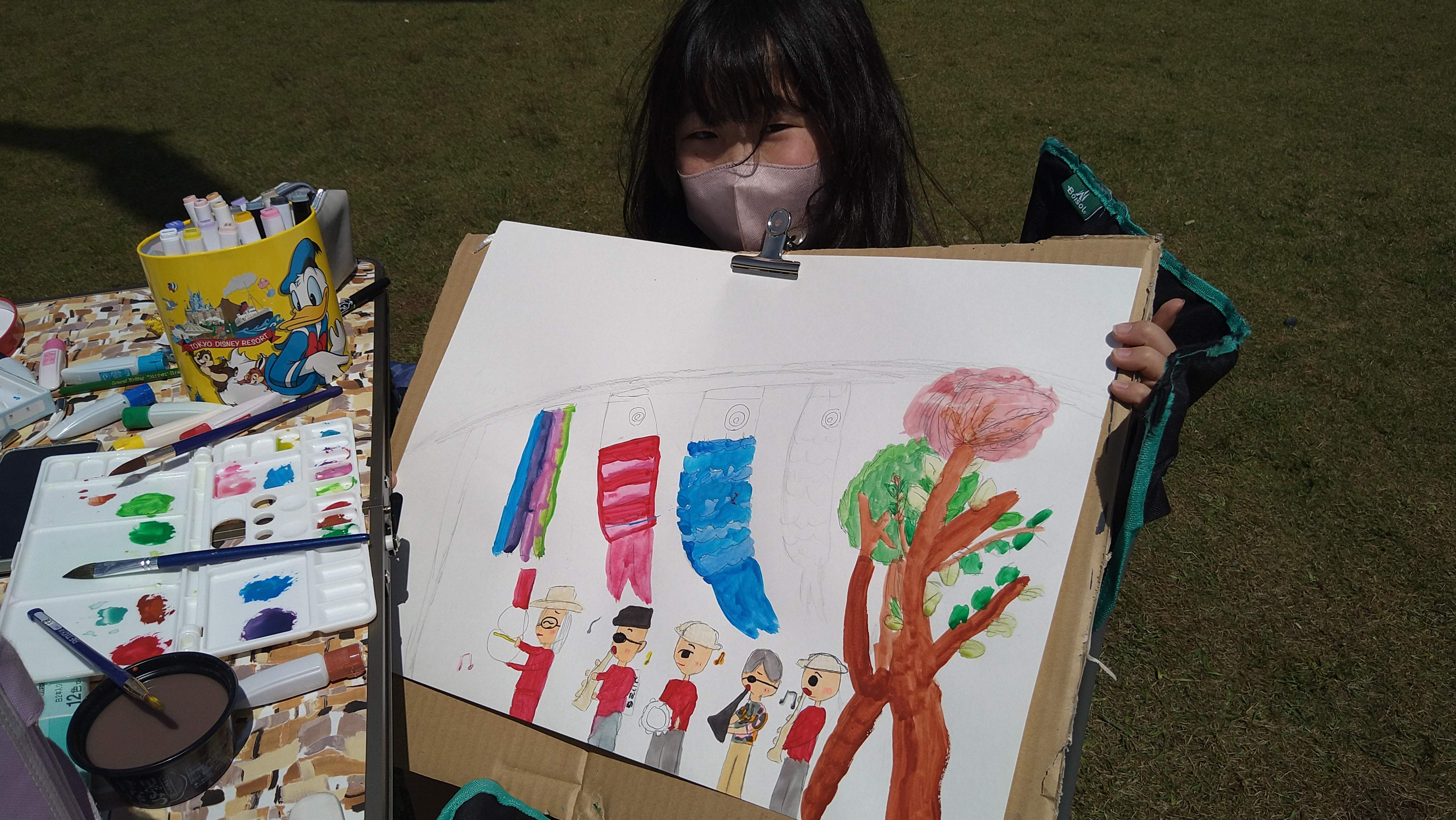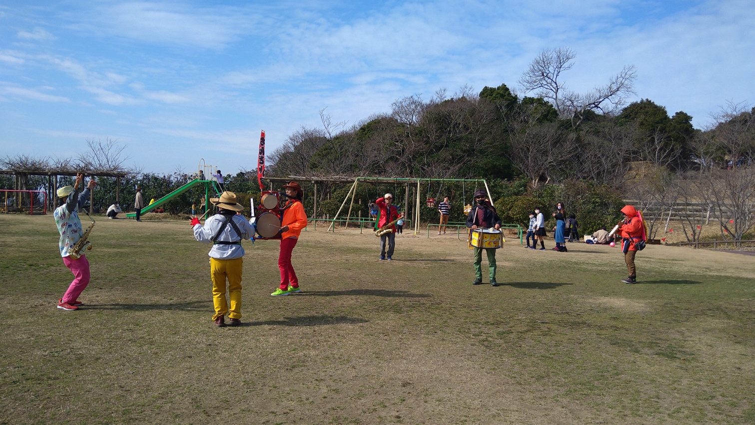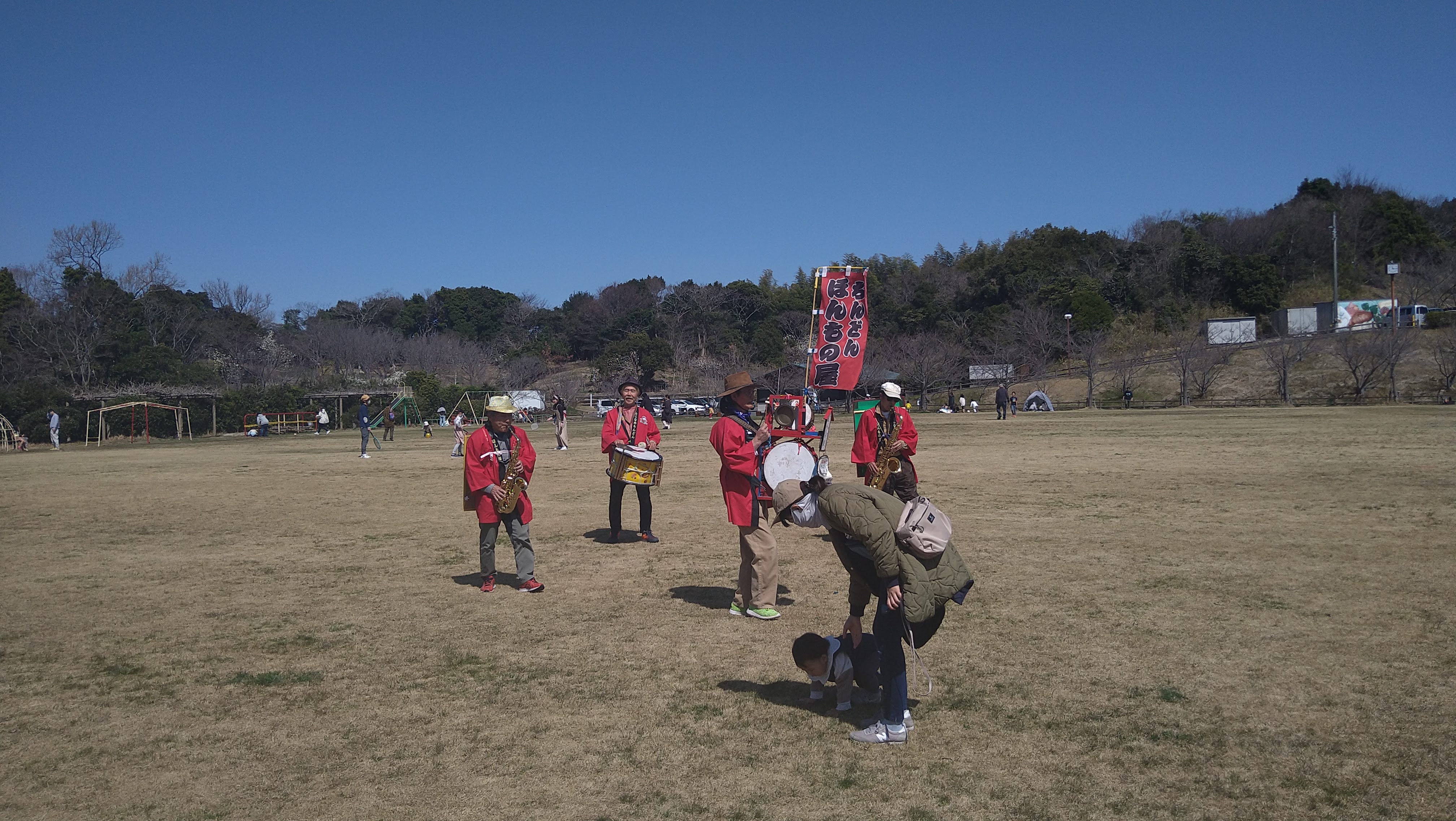 今日に日曜興業は、4名(空氏除く)。海に白波がたっているものの、風もそれほどでもなく、日差しもある。運動場での子供連れも親子合わせて20名以上はいる。演奏し始めると興味津々な子供もよってくる。