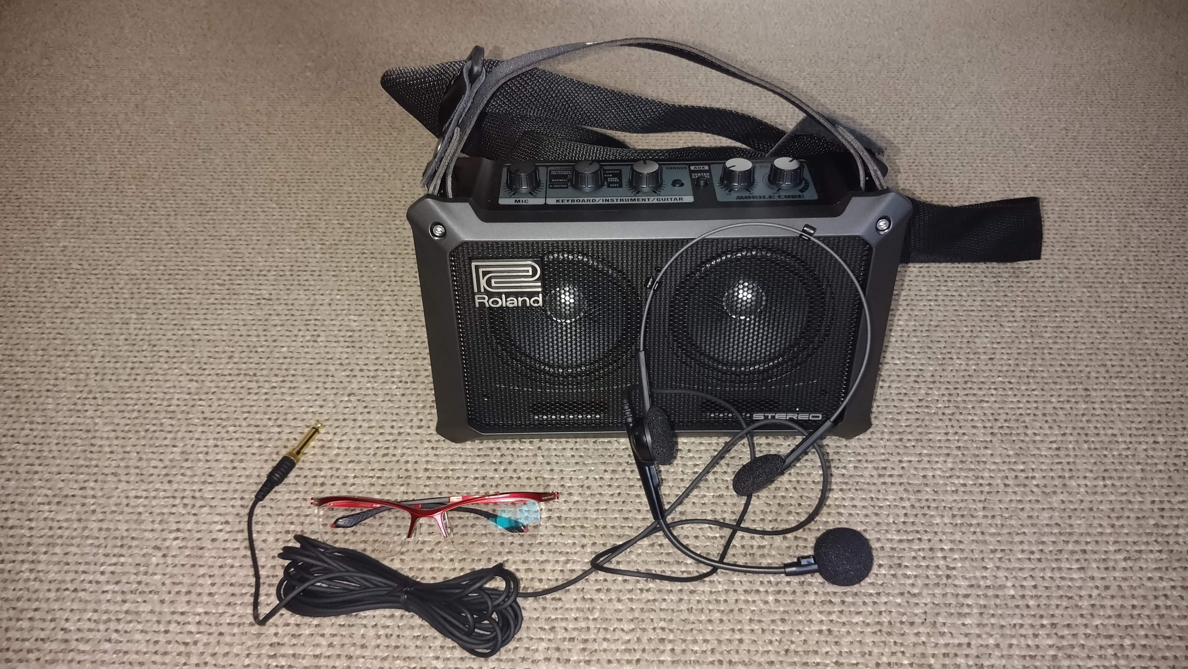 外で練り歩きには、楽器そのものの本体の音量が貧弱なので同時に拡声器2器使っていた。