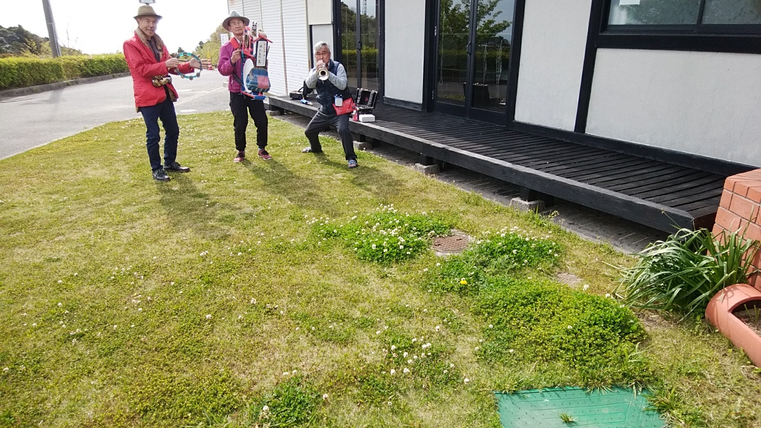 日曜日の午後に電話で、「利用者さんがチンドン屋が懐かしいので、チンドン屋呼んでくれんかと要望があり、(彼は)病気で・・いつでもいいというわけにはいかないので、すぐにでも来てくれないか」と、某施設から依頼連絡があった。2日後の依頼であった。最低2人でやれば何とか形のなるので、これそうな3人のメンバーに連絡を入れ、2人から快諾があった。