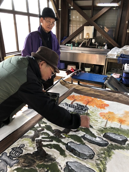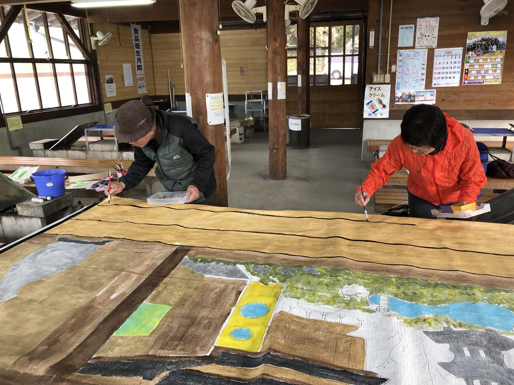 メンバーの招猫友氏のご子息、友人もお手伝いに駆けつけてくれ、総勢9名で午前10時半より、午後3時まで昼食時間除き、4時間ほどかけて横断幕を完成させました。